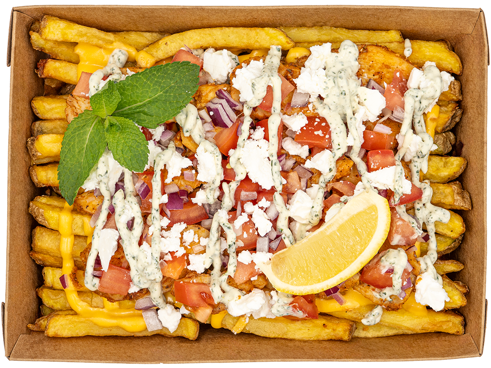 Frytki The Fry, sos z sera cheddar, kurczak gyros, ser feta, świeże pomidory,