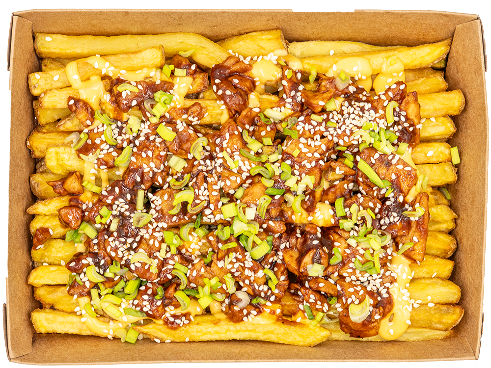 Frytki The Fry, sos z sera cheddar, kurczak korean bbq, szczypior, sezam